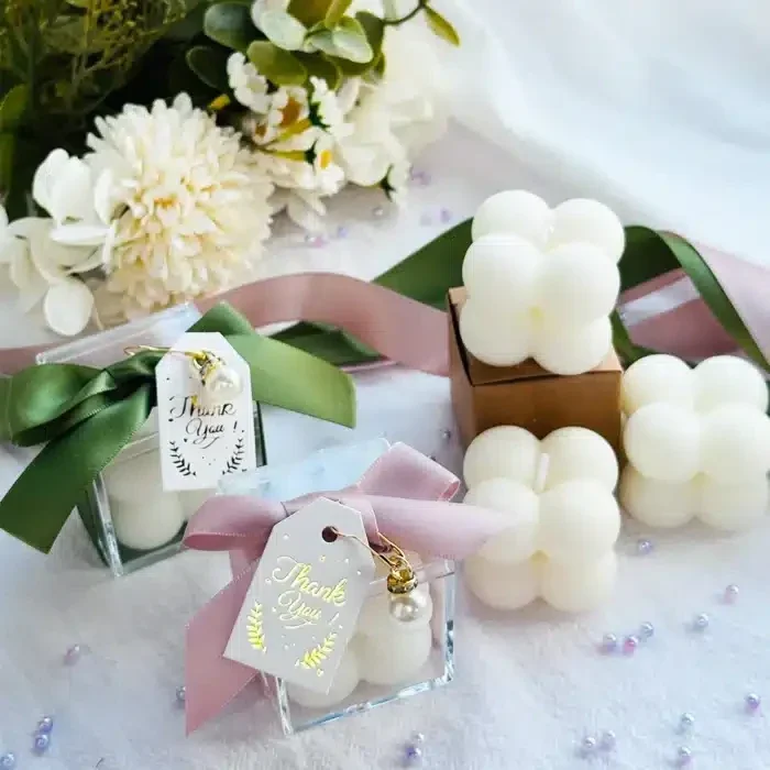 Nous concevons aussi des bougies personnalisées pour vos invités : un cadeau chic, tendance et rempli d’émotion, qui laissera un souvenir précieux de votre journée.